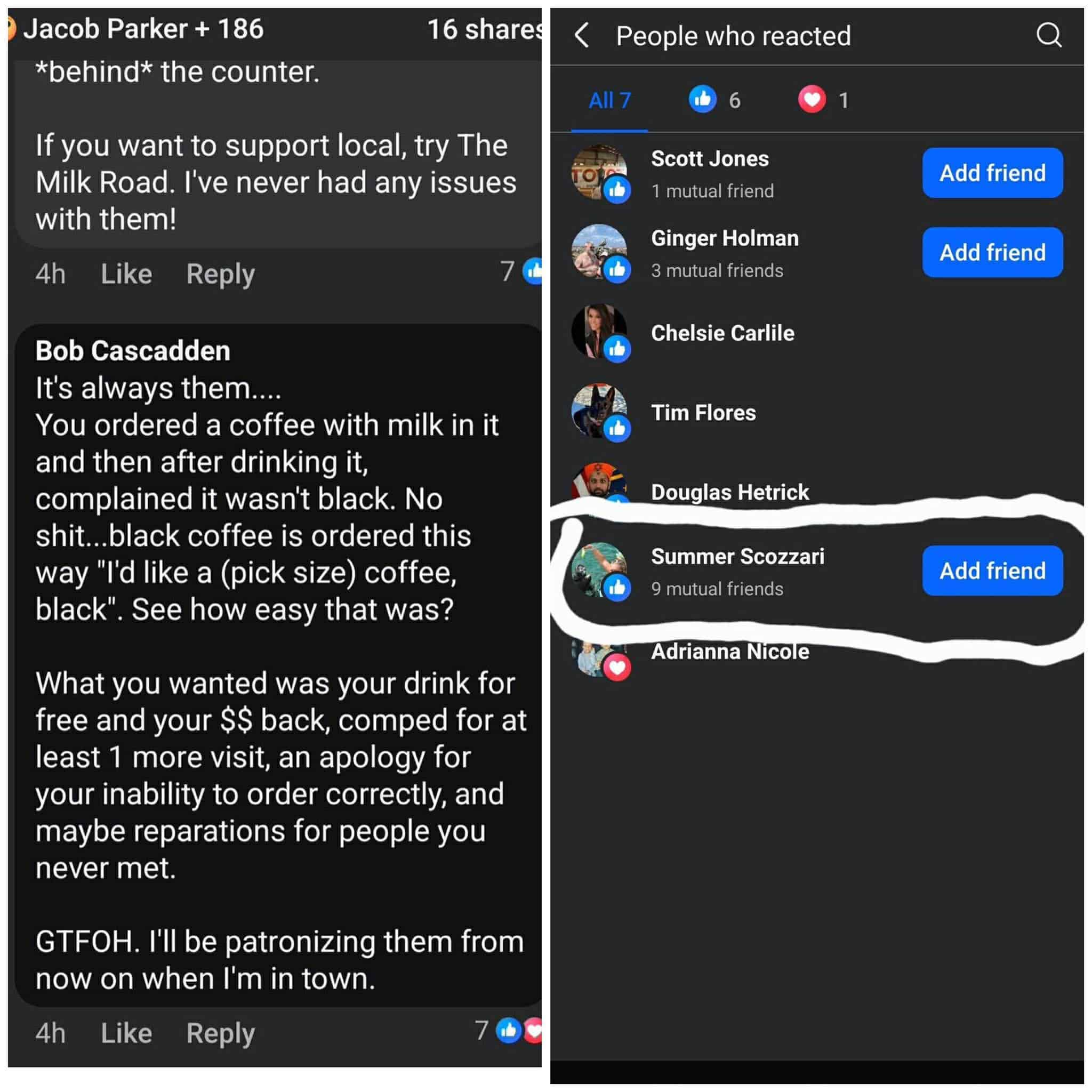 According to the screenshot circulating online, the comment went on to criticize the customer, saying she ordered coffee with milk in it and then complained it was not black, while also accusing her of trying to get free items, money back, and even “reparations for people you never met.” Another screenshot appears to show Summer’s profile among the people who reacted to that comment.
