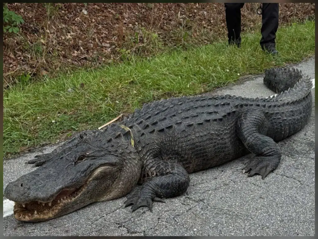 Witnesses say the alligator caught in Onslow County looked completely unbothered by passing traffic, clearly ignoring all signs prohibiting “loitering or lounging on roadways.” The reptile, affectionately nicknamed “Pepe the Gator” by amused locals, measured nearly 10 feet long and weighed an estimated 350 to 400 pounds.
