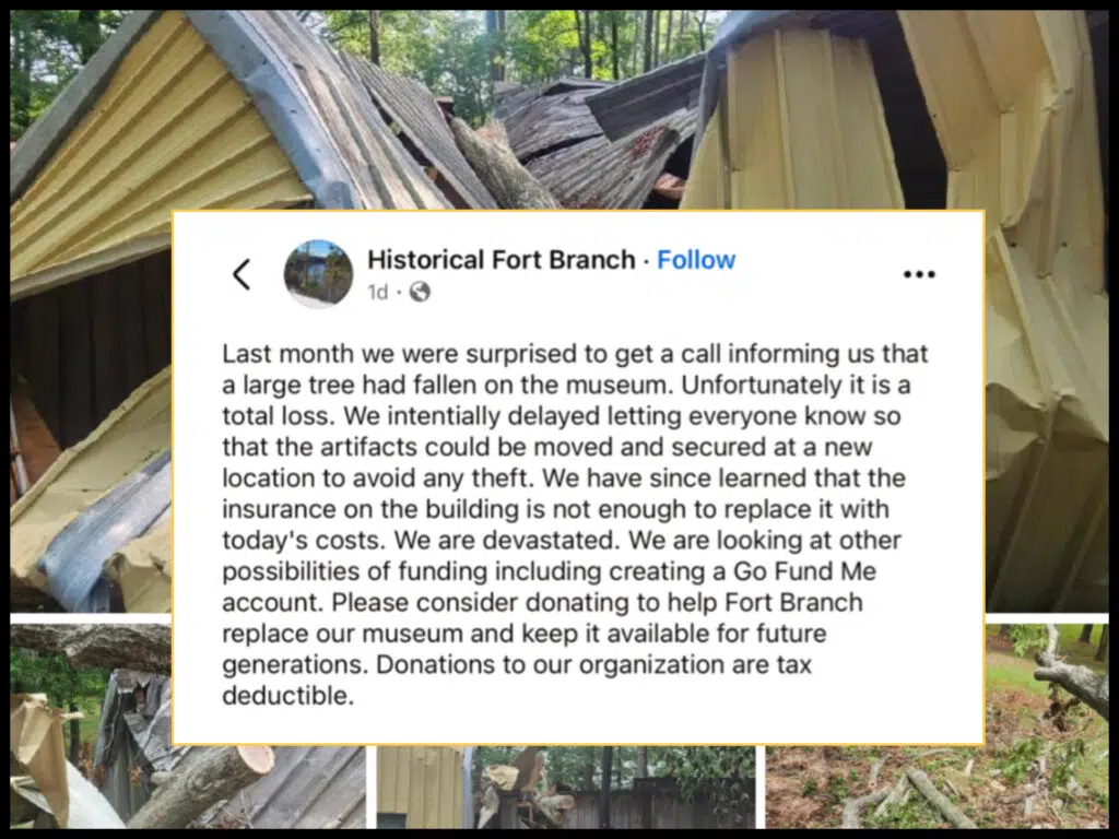 “We are devastated,” Historical Fort Branch said. “Please consider donating to help Fort Branch replace our museum and keep it available for future generations.”
