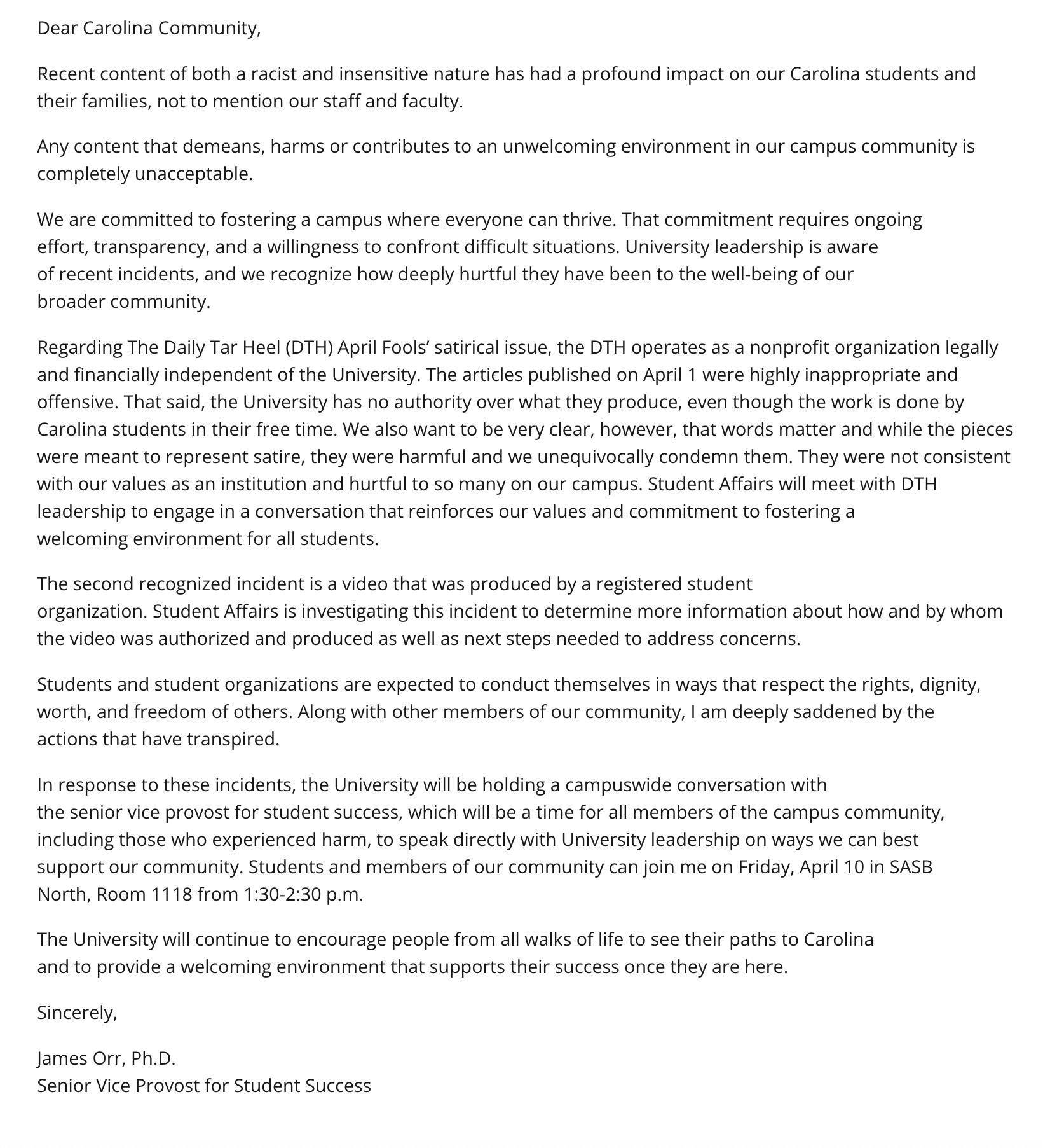 In response to early backlash, UNC Senior Vice Provost James Orr issued a statement condemning what he described as “racist and insensitive” content and indicated the university was investigating the situation.