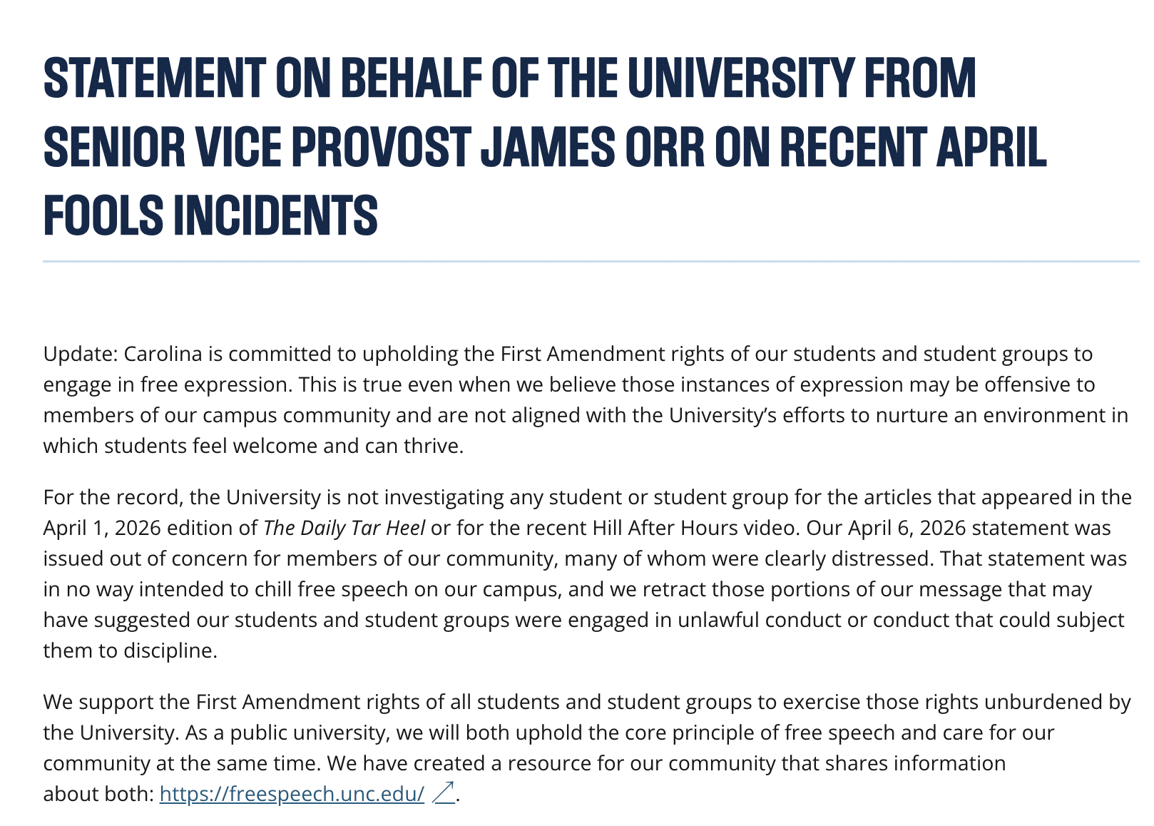 In an updated statement released Thursday, April 16, 2026, UNC said it would not investigate or discipline any students involved, emphasizing that the content is protected speech.