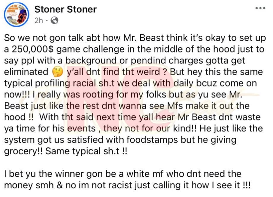 GREENVILLE, N.C. – A Facebook post is gaining traction after a user accused YouTube superstar MrBeast, whose real name is Jimmy Donaldson, of pulling some shady behavior during a $250,000 game challenge that was allegedly set up in the hood.