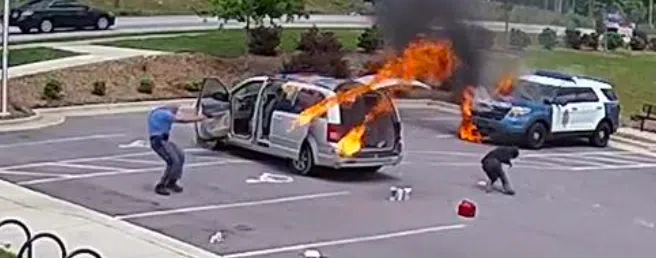 Police said 37-year-old Reuel Rodriguez Nunez drove a silver van into the parking lot of the Southeast District Raleigh Police Station on Rock Quarry Road and lit two police patrol cars on fire.