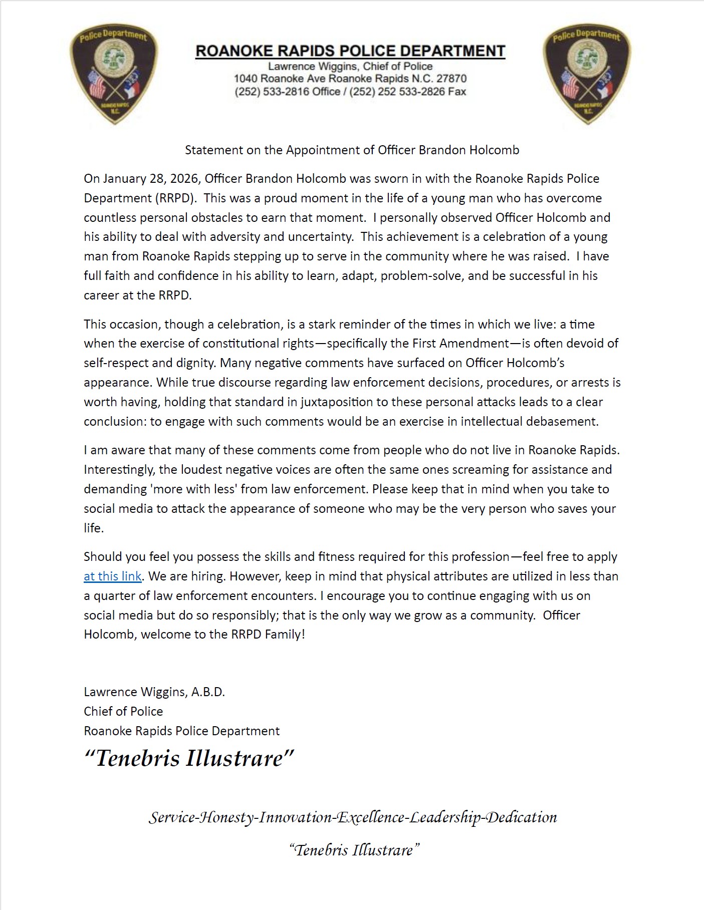 READ THE FULL STATEMENT FROM CHIEF WIGGINS BELOW: