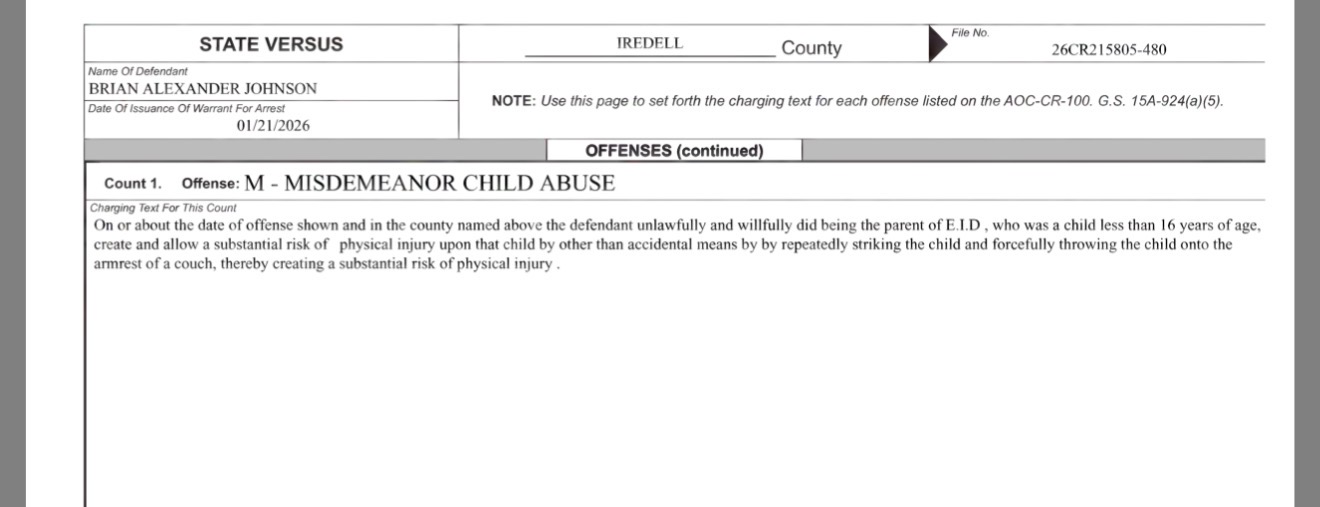 Johnson was arrested Wednesday and appeared before a judge Thursday, where his bond was set at $50,000 secured, according to Iredell County court records.