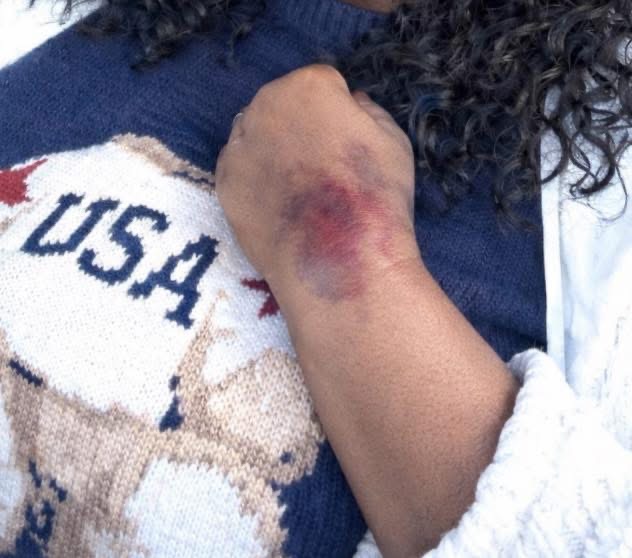 “I told him I have a broken foot and broken knee,” she wrote in a public statement. “He grabbed me by my wrist and pulled me out.”
