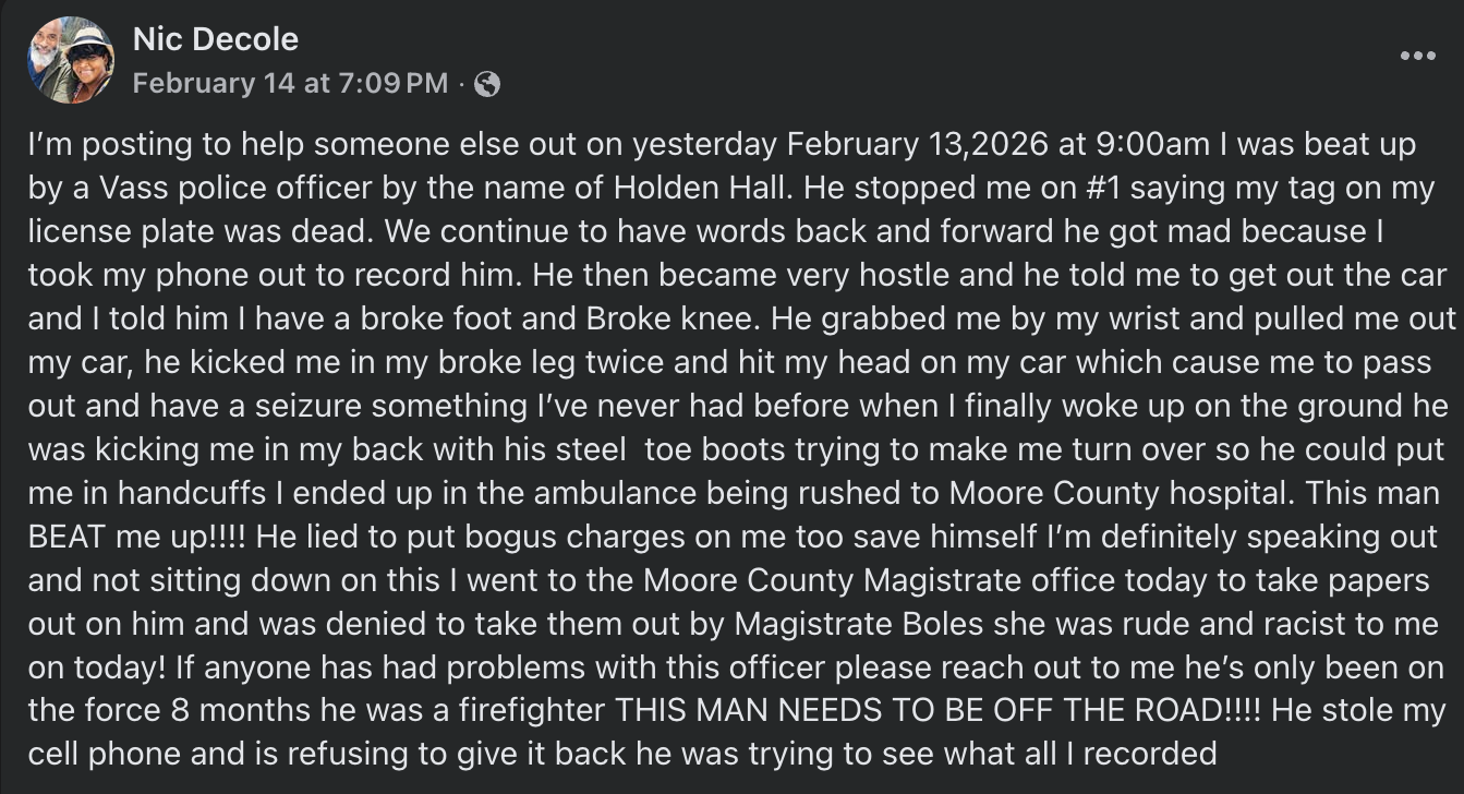 As of publication, the Vass Police Department has not issued a public statement regarding the allegations. It is unclear whether body camera footage exists or whether an internal investigation has been launched.