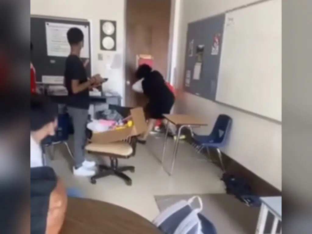 The teacher told the classroom that the student she had just finished allegedly assaulting doesn’t get to hit her, and neither do they, referring as if the student she tussled to the ground first attacked her.