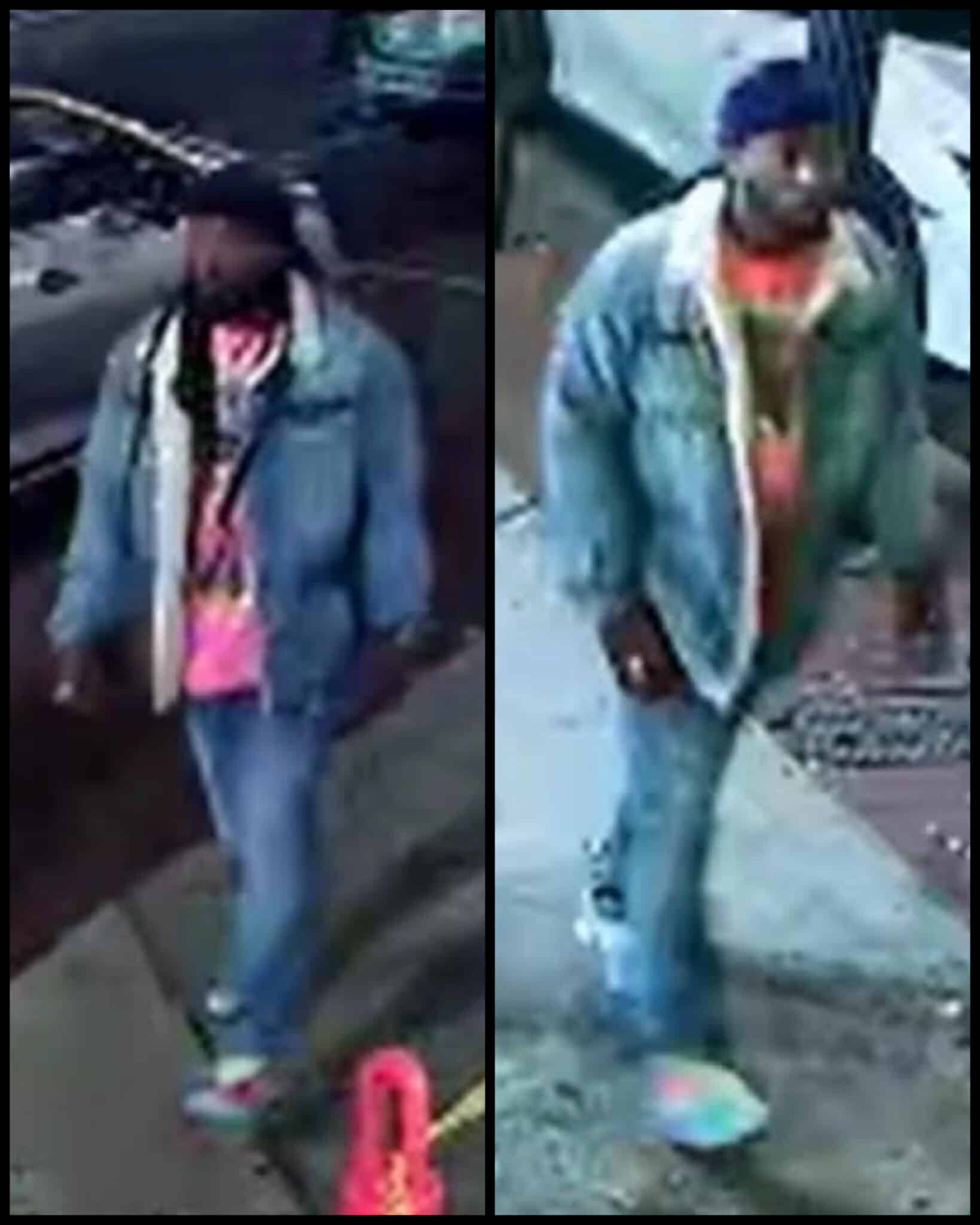 He is described as an adult Black male with a medium build. Photos show him wearing a light-colored, fleece-lined denim jacket, light-colored denim pants, a pink shirt, and white sneakers with blue and red accents.